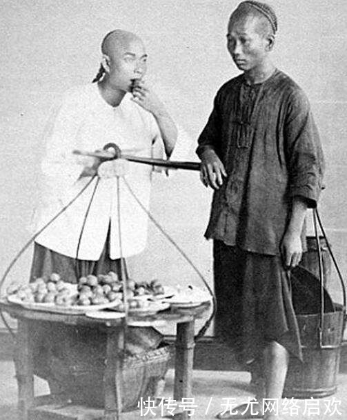 图:晚清卖水果的小商贩;画面中商贩正在为顾客试吃自己的水果。