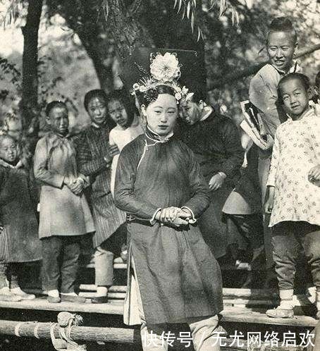 1912年大清王朝灭亡之后,虽然皇帝的尊称还在,皇上也可以照旧居住在紫禁城,但是有的从小便入宫的妃子纷纷离开皇宫,来到阔别已久的家乡生活。图:一位穿着旗袍已经离开紫禁城的妃子站在镜头前,照片上的她很美,或许也是因为美貌,所以引来众人的围观!