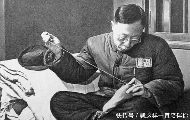 6.这也是溥仪在服役期间,劳改的生活真实写照,他盘腿坐在自己的床铺上,在缝补自己的袜子,很认真,很安详。好像并没有注意到自己被拍。