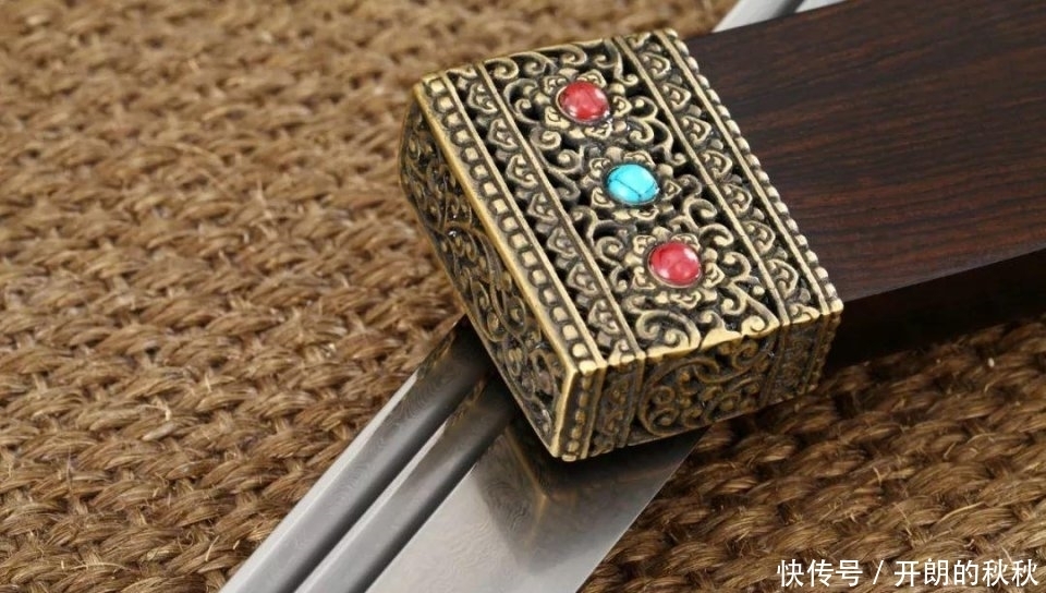 观之装具,采用黄铜雕刻卷草纹并装饰绿松石和红宝石,精致美观,瞬间提升了整把刀的档次。