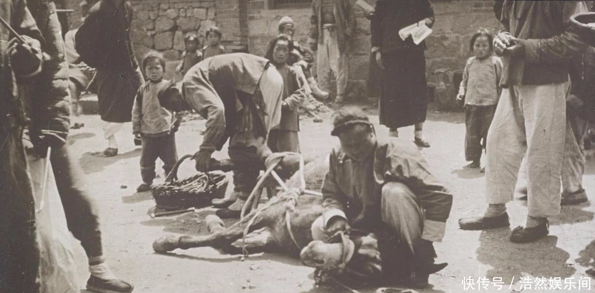 图为两个清朝人在给马套上缰绳和马掌,他们合力按住了这匹马,力气还是非常大的。