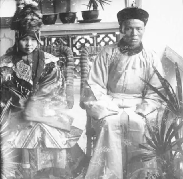 一对新婚夫妻,新娘扭捏,新郎对着镜头有种惊惧的神色。对于西方的这洋玩意,民间对其很好奇,又在镜头面前都非常不自然。不过能留下一张结婚照片,在当时也不是一般人家。