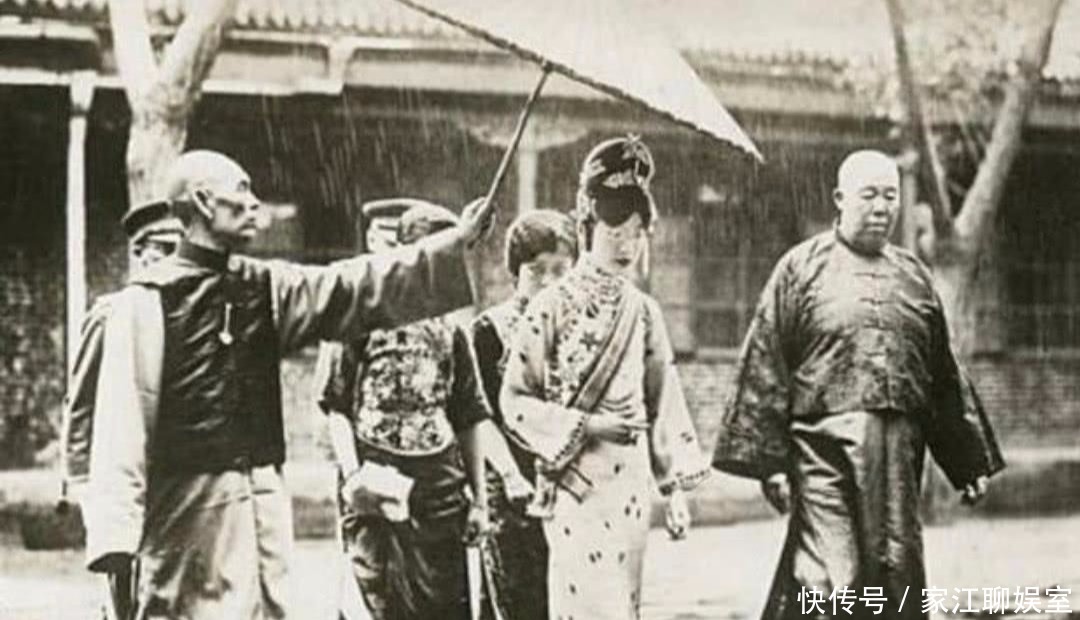 皇后婉容着盛装出门,尽管下着倾盆大雨。跟随的太监只能给皇后打着伞,自己俨然成了落汤鸡。溥仪遣散了很多宫女太监,跟着的都是心腹。