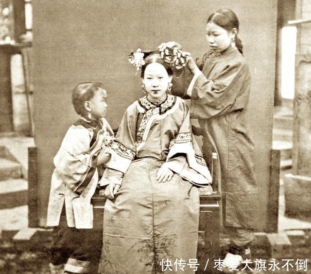 晚清官员和女人的真实老照片:图为晚清一位大户人家的夫人坐在凳子上,有点驼背,她的女儿站在旁边看着她,一个丫鬟正在帮她梳着头。