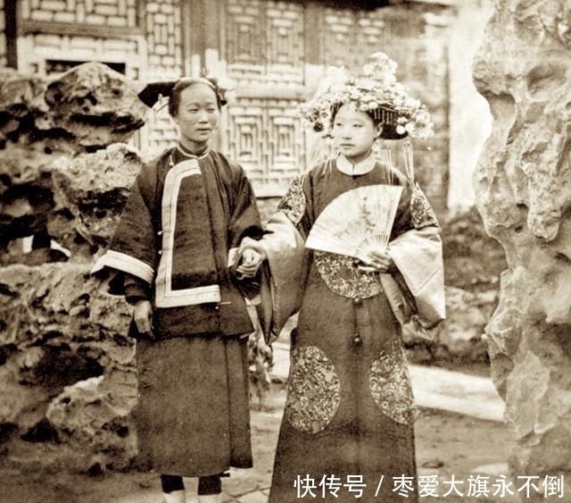 晚清官员和女人的真实老照片:图为晚清一位官员的夫人和一位女佣人在花园里,夫人左手拿着扇子,右手搭在佣人手上,头上的头饰非常豪气。