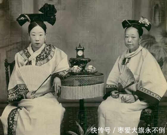 晚清官员和女人的真实老照片:图为晚清一个满清贵族的两个妻妾,两个人年龄相差挺多,左边的女子虽然比较年轻,但是长得有点奇怪。