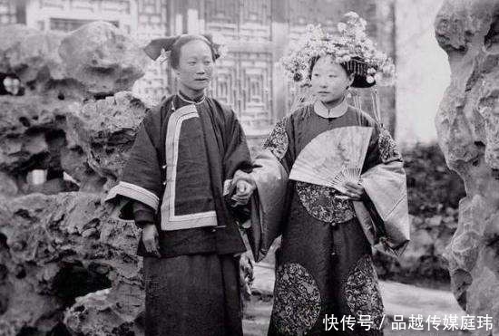 两个清朝女子在自家花园中闲逛,好像在窃窃私语什么。