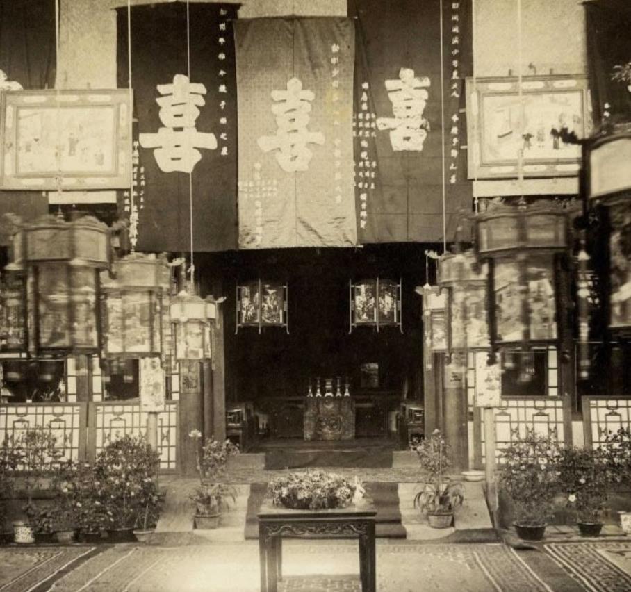图为清朝末年京城里旗人家族的新婚场景老照片,老照片中的新婚庭院布置装扮一新,大红喜字醒目的贴在正厅上方的幔布上,将新婚之喜的欢喜洋溢的淋漓尽致。