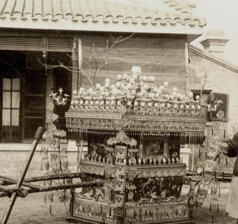 这是清朝末年大户人家成亲时所用的大红花轿,老照片中的花轿缀满珠冠玉翠,花轿通体琳琅满目十分的精美华贵。古人十分重视婚嫁明媒正娶,所用成亲时所用的花轿亦是十分的华贵。