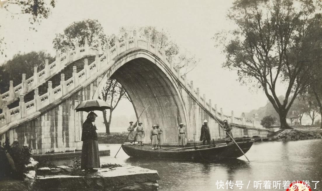 照片中的人物应该都是打理颐和园的太监。这座桥有17个桥洞,长150米,飞跨于东堤和南湖岛,状若长虹卧波。桥上石雕极其精美,每个桥栏的望柱上都雕有神态各异的狮子,大小共544个。