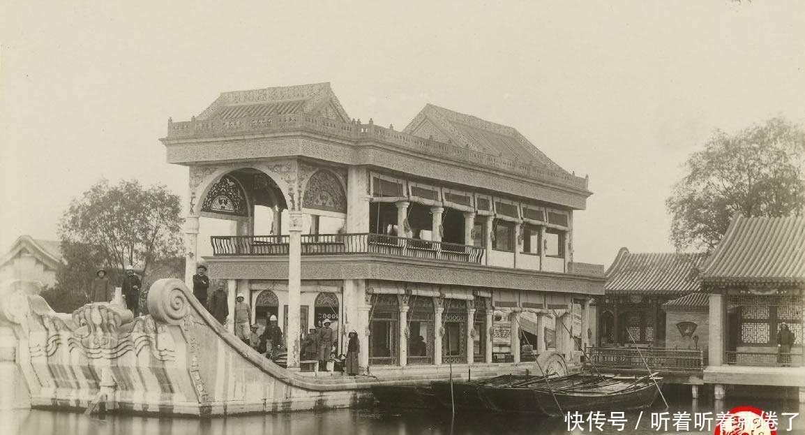 慈禧邀请的驻华外交官员正在参观游玩。英法联军入侵时,舫上的中式舱楼被焚毁,1893年重建时,改为西洋式楼阁,并配以彩色玻璃窗。慈禧常在此品茗、赏景。