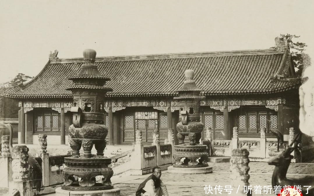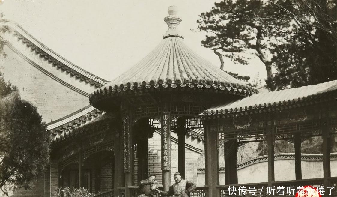 颐和园内的宫殿,一个太监懒散地蹲在地上。