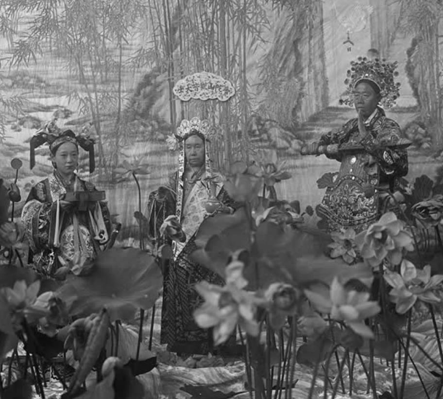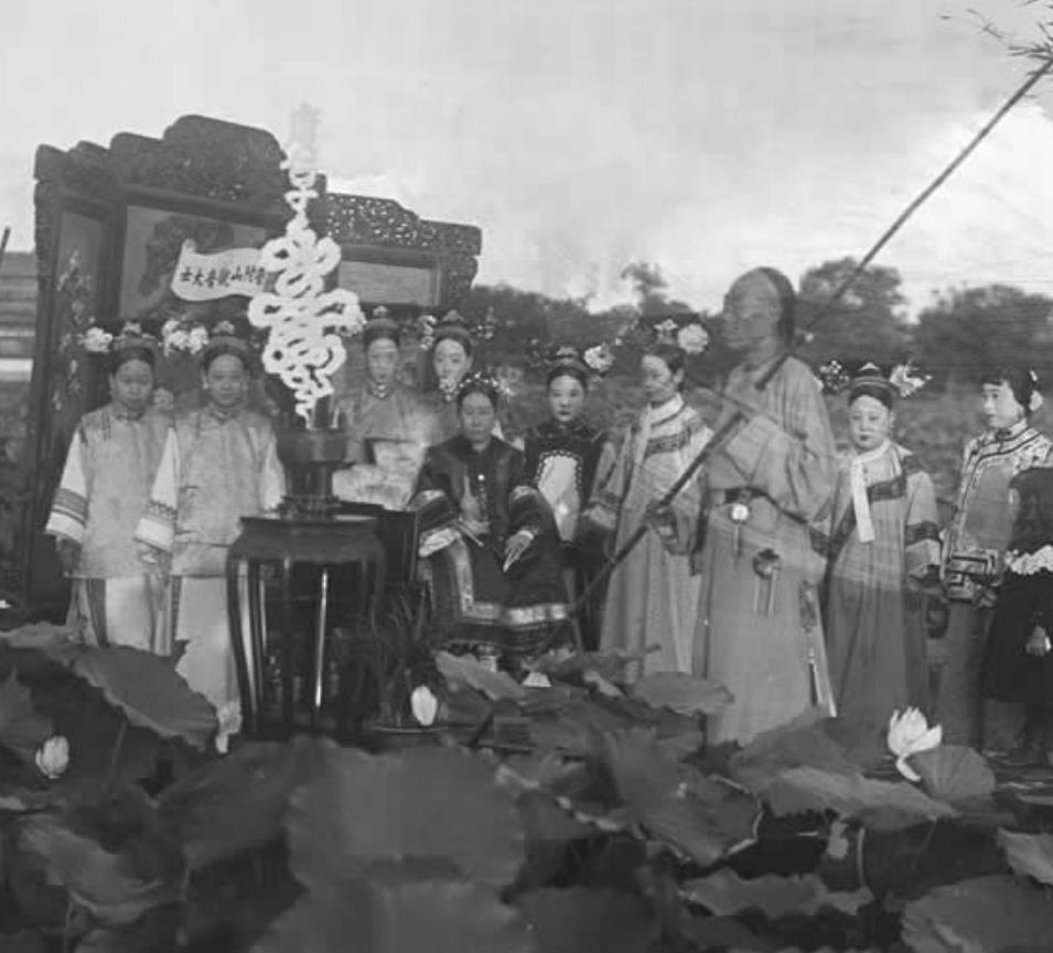 图为慈禧太后在过六十大寿时候的珍贵旧照,老照片中的慈禧太后一身素衣打扮,站在身旁的是瑾妃及公使夫人路易莎皮尔森。慈禧太后喜爱荷花,李莲英为了讨其欢心,故在荷花池为慈禧太后搭建戏台祝寿。