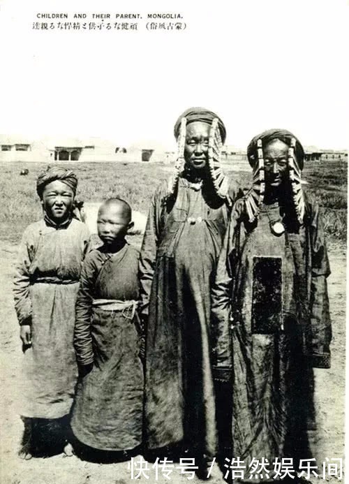 图:外蒙的一家四口,他们带着奇特的装饰,用来遮挡阳光,