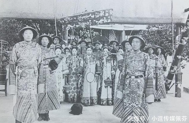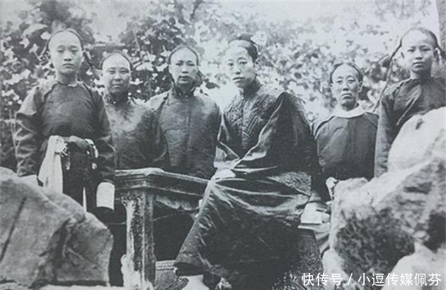 图六:隆裕太后和身后的五个太监。从照片中我们可以看出,宫廷规矩虽然很多,但是太监们平时的穿着还是很随意的,并没有那么多要求。照片中最左边和最右边的两个太监看起来年龄都不大,还留着两个辫子,很是独特。