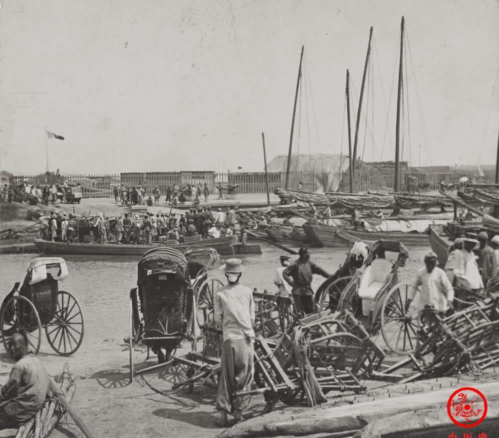天津海河上的一座小码头,岸边停着揽客的人力车和拉货的独轮车。