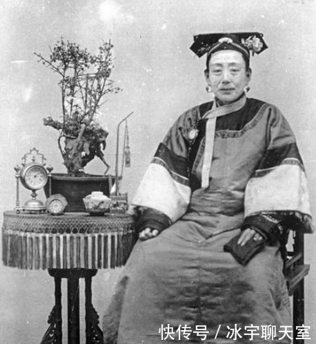 图为一位年老的旗人妇女。桌上的钟表可以看得出来家族式非常富裕的,衣食无忧。