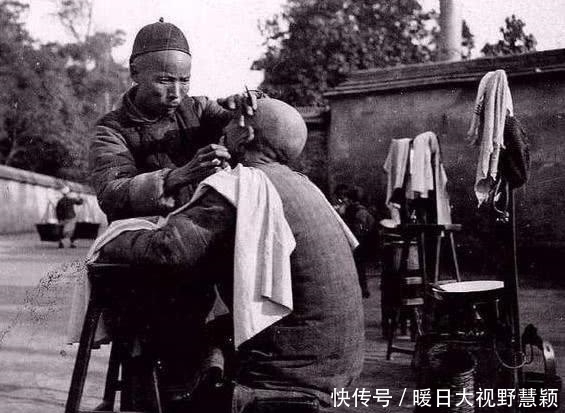 第二幅图是一个剃头匠再给街上人剃头的情景,要知道在清朝时期可没有什么电动推子,所有的东西都需要用刀具来完成,而笔者家中还有一个八十年代老北京的剃刀,跟晚清时期的剃刀也算是十分相近,而图中的剃头匠真正专心致志的给人剃头,而周围的工具也是一应俱全,可见当时的剃头匠十分的敬业。