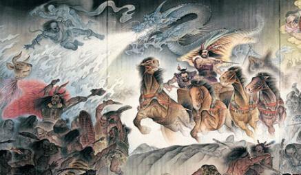 黄帝与蚩尤为争夺适合种植居住的中原地带,在涿鹿这个地方展开了一场难解难分的大战。蚩尤降下三日不散的浓雾围困黄帝部队,以此来打乱对方节奏,而后突袭。在被围困的危难之中,黄帝通过夜晚的北斗七星,做出了指南车逃过一劫。随后蚩尤派遣拥有神力的风伯雨师与黄帝部落的应龙斗法,天地之间顷刻降下狂风暴雨,黄帝部队眼看就要战败。
