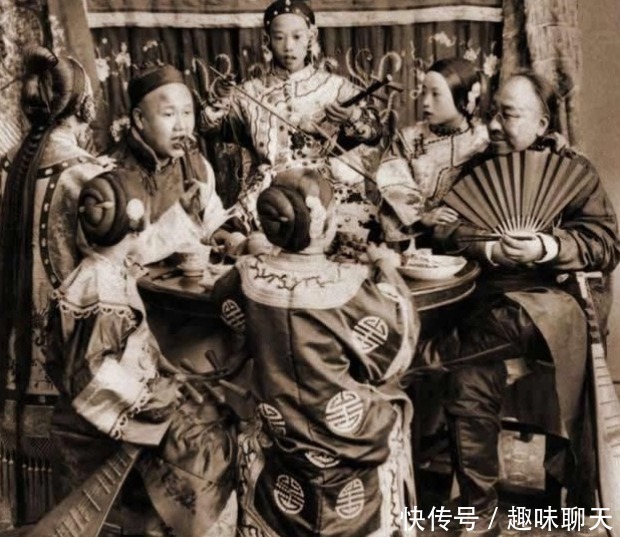 这是青楼女子服侍官员的照片,两个官员周围围绕着五个妓女,可见这两个人的身份地位,有的妓女在旁边唱歌弹曲儿,有的妓女负责喂饭喝酒。