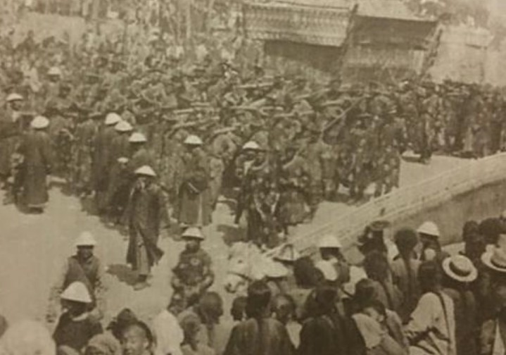 这些扛枪的士兵与封建时代的太监们走在一起,显得有些格格不入,也许这正标志着旧时代的覆灭和新时代的到来。
