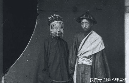 清末广州的一对新郎新娘,新郎目光呆滞。